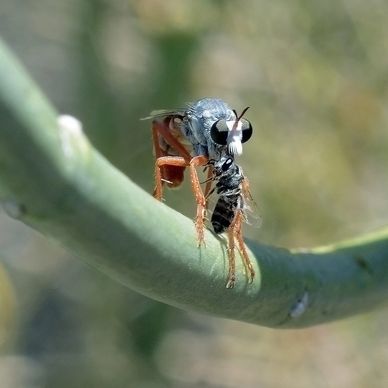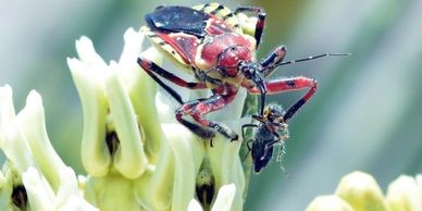 With its prey, a small sweat bee, captured on a rush milkweed, at Lake Mead National Recreation Area, Nevada